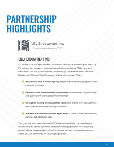 LILLY ENDOWMENT INC.PARTNERSHIP HIGHLIGHTSIn October 2025, we were thrilled to announce a landmark $10 million grant from Lilly Endowment Inc. to support the enhancement and expansion of PCA%u2019s programs nationwide. This five-year investment, made through Lilly Endowment%u2019s Character Development Through Youth Programs initiative, will empower PCA to: Reach more than 1.5 million young people nationwide through sports-based character educationExpand access in underserved communities where barriers to participation and quality youth sports programs remain highStrengthen training and support for coaches to ensure every young athlete has a positive, character-building experienceEnhance our infrastructure and digital tools to better connect with coaches, parents, and athletes at scaleThis grant marks a major milestone in PCA%u2019s growth and impact, accelerating our mission to make sports a powerful, character-building experience for every young person. We are deeply grateful to Lilly Endowment for their trust and partnership%u2014and to you, our community for your ongoing support. 9