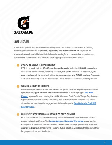 In 2025, our partnership with Gatorade strengthened our shared commitment to building a youth sports culture that is positive, equitable, and accessible for all. Together, we advanced several core initiatives that delivered meaningful and measurable impact across communities nationwide%u2014and here are a few highlights of that work in action:GATORADECOACH TRAINING & RECRUITMENTPCA is on track to train 65,000 coaches nationwide, including 26,000 from underresourced communities, reaching over 550,000 youth athletes. In addition, 3,500 new coaches will be recruited, with a focus on women and BIPOC leaders. Gatorade co-branded training tools are featured on PCA%u2019s national coach recruitment platform.WOMEN & GIRLS IN SPORTSGatorade supported PCA%u2019s Women & Girls in Sports Initiative, expanding access and opportunity for girls of color and women coaches. A 2025 highlight: Fuel HER Future, a powerful event during the NCAA Women%u2019s Final Four in Tampa Bay, brought together coaches and leaders%u2014including Hall of Famer Muffet McGraw%u2014to share strategies for keeping girls engaged and thriving in sports. See Gatorade FuelHER Event Photos.INCLUSIVE STORYTELLING & RESOURCE DEVELOPMENTPCA and Gatorade co-created culturally responsive content and resources shared across national platforms. The Fusion Latina x Gatorade Workshop was a perfect example of a stand out moment where PCA delivered its flagship coaching workshop entirely in Spanish, empowering Hispanic f%u00fatbol coaches with tools that honored their language, culture, and leadership.11