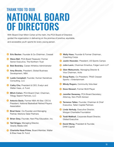 NATIONAL BOARD OF DIRECTORSTHANK YOU TO OURWith Board Chair Mitch Cohen at the helm, the PCA Board of Directors guided the organization in delivering on the promise of positive, equitable, and accessible youth sports for every young person.Eric Becker, Founder & Co-Chairman, CressetSteve Bell, PCA Board Treasurer; Former Senior Executive, The Northern TrustBob Bowlsby, Career Athletics AdministratorAmy Brooks, President, Global Business Development, NBALeslie Campbell, Founder, Human Narratives Consulting, LLCCathy Cha, President & CEO, Evelyn and Walter Haas, Jr. FundMitch Cohen, PCA Board Chair; Chairman, Trilogy Search Partners, LLCAntonio Davis, Former NBA All-Star; CEO & President, National Basketball Retired Players AssociationBrad Geier, Co-Founder and Managing Partner, Merlone Geier PartnersBrian Grey, Founder, Next Play Education, Inc.Ted Griggs, Managing Director, Gravity Media USACharlotte Haas Prime, Board Member, Walter & Elise Haas Sr. FundWally Haas, Founder & Former Chairman, Coaching CorpsJustin Hoeveler, President, US Sports CampsJohn Levin, Chairman Emeritus, Folger Levin LLPGlen Matsumoto, Managing Director & Vice Chairman, ActisDoug Raetz, Co-President, TRUE Cresset Sports + Entertainment Mindy Rogers, Community VolunteerDave Stewart, Former MLB PlayerJennifer Sweeney, PCA Board Secretary;Attorney, Non-Profit AdvisorTerrence Tallen, Founder, Chairman & Chief Executive, Tallen Capital PartnersLinda Verhulp, Executive Director, Morgan Charitable FoundationTodd Walthall, Corporate Board Director, Global ExecutiveDavid Wong, President & Founder, DHW Capital13