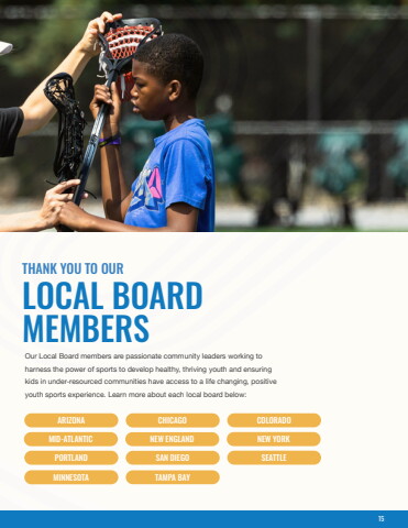 LOCAL BOARDMEMBERSTHANK YOU TO OUROur Local Board members are passionate community leaders working to harness the power of sports to develop healthy, thriving youth and ensuring kids in under-resourced communities have access to a life changing, positive youth sports experience. Learn more about each local board beloARIZONA CHICAGO COLORADOMID-ATLANTIC NEW ENGLAND NEW YORKPORTLAND SAN DIEGO SEATTLEMINNESOTA TAMPA BAY15