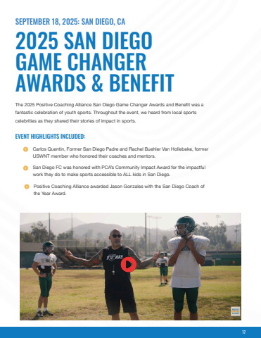 The 2025 Positive Coaching Alliance San Diego Game Changer Awards and Benefit was a fantastic celebration of youth sports. Throughout the event, we heard from local sports celebrities as they shared their stories of impact in sports.EVENT HIGHLIGHTS INCLUDED:2025 SAN DIEGO GAME CHANGER AWARDS & BENEFITSEPTEMBER 18, 2025: SAN DIEGO, CAPositive Coaching Alliance awarded Jason Gonzales with the San Diego Coach of the Year Award.Carlos Quentin, Former San Diego Padre and Rachel Buehler Van Hollebeke, former USWNT member who honored their coaches and mentors.San Diego FC was honored with PCA%u2019s Community Impact Award for the impactful work they do to make sports accessible to ALL kids in San Diego.17