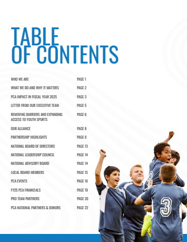 TABLE OF CONTENTSWHO WE ARE PAGE 1 WHAT WE DO AND WHY IT MATTERS PAGE 2 PCA IMPACT IN FISCAL YEAR 2025 PAGE 3 LETTER FROM OUR EXECUTIVE TEAM PAGE 5 REMOVING BARRIERS AND EXPANDING PAGE 6 ACCESS TO YOUTH SPORTSOUR ALLIANCE PAGE 8 PARTNERSHIP HIGHLIGHTS PAGE 9 NATIONAL BOARD OF DIRECTORS PAGE 13NATIONAL LEADERSHIP COUNCIL PAGE 14NATIONAL ADVISORY BOARD PAGE 14LOCAL BOARD MEMBERS PAGE 15PCA EVENTS PAGE 16FY25 PCA FINANCIALS PAGE 19 PRO TEAM PARTNERS PAGE 20PCA NATIONAL PARTNERS & DONORS PAGE 22