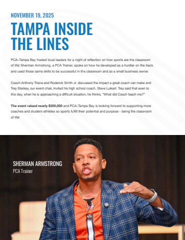 PCA%u2013Tampa Bay hosted local leaders for a night of reflection on how sports are the classroom of life! Sherman Armstrong, a PCA Trainer, spoke on how he developed as a hurdler on the track and used those same skills to be successful in the classroom and as a small business owner. Coach Anthony Triana and Roderick Smith Jr. discussed the impact a great coach can make and Trey Starkey, our event chair, invited his high school coach, Steve Luikart. Trey said that even to this day, when he is approaching a difficult situation, he thinks, %u201cWhat did Coach teach me?%u201dThe event raised nearly $300,000 and PCA-Tampa Bay is looking forward to supporting more coaches and student-athletes so sports fulfill their potential and purpose - being the classroom of life! TAMPA INSIDE THE LINESNOVEMBER 19, 2025SHERMAN ARMSTRONGPCA Trainer18