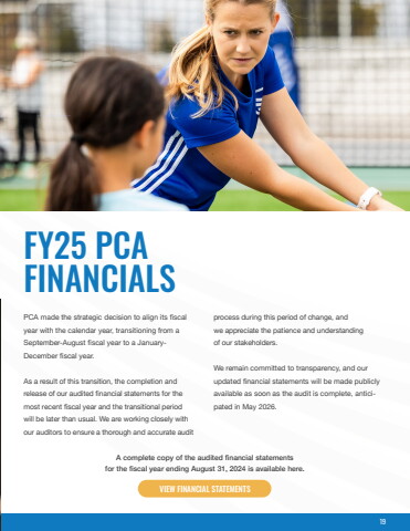 PCA made the strategic decision to align its fiscal year with the calendar year, transitioning from a September-August fiscal year to a JanuaryDecember fiscal year. As a result of this transition, the completion and release of our audited financial statements for the most recent fiscal year and the transitional period will be later than usual. We are working closely with our auditors to ensure a thorough and accurate audit FY25 PCA FINANCIALSprocess during this period of change, and we appreciate the patience and understanding of our stakeholders.We remain committed to transparency, and our updated financial statements will be made publicly available as soon as the audit is complete, anticipated in May 2026.A complete copy of the audited financial statements for the fiscal year ending August 31, 2024 is available here.VIEW FINANCIAL STATEMENTS19