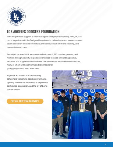 With the generous support of the Los Angeles Dodgers Foundation (LADF), PCA is proud to partner with the Dodgers Dreamteam to deliver in-person, research-based coach education focused on cultural proficiency, social-emotional learning, and trauma-informed care. From April to June 2025, we connected with over 1,360 coaches, parents, and mentors through powerful in-person workshops focused on building positive, inclusive, and supportive team cultures. We also helped recruit 865 new coaches, many of whom will become trusted role models for young players who need them most. Together, PCA and LADF are creating safer, more welcoming sports environments%u2014opening the door for more kids to experience confidence, connection, and the joy of being part of a team.LOS ANGELES DODGERS FOUNDATIONSEE ALL PRO TEAM PARTNERS21