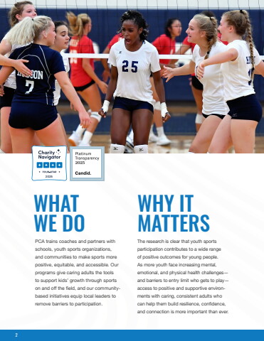 PCA trains coaches and partners with schools, youth sports organizations, and communities to make sports more positive, equitable, and accessible. Our programs give caring adults the tools to support kids%u2019 growth through sports on and off the field, and our communitybased initiatives equip local leaders to remove barriers to participation.WHY IT MATTERSThe research is clear that youth sports participation contributes to a wide range of positive outcomes for young people. As more youth face increasing mental, emotional, and physical health challenges%u2014and barriers to entry limit who gets to play%u2014access to positive and supportive environments with caring, consistent adults who can help them build resilience, confidence, and connection is more important than ever.WHAT WE DO20252