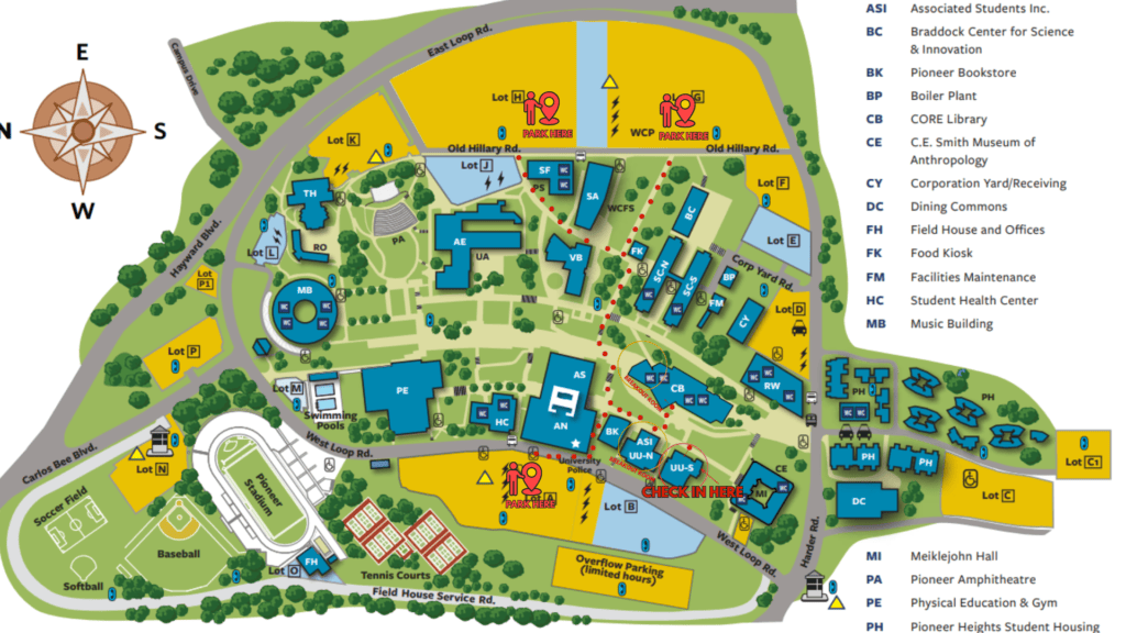 • Type in “Parking Lot A, CSU East Bay” in your navigation system. All yellow parking lots on the map are free on Saturdays. Lot A is the closest.